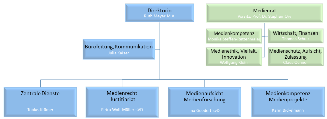 Die Organe der LMS mit jeweils zugewiesenen Aufgaben sind der ehrenamtlich arbeitende Medienrat und die Direktorin mit der Verwaltung.