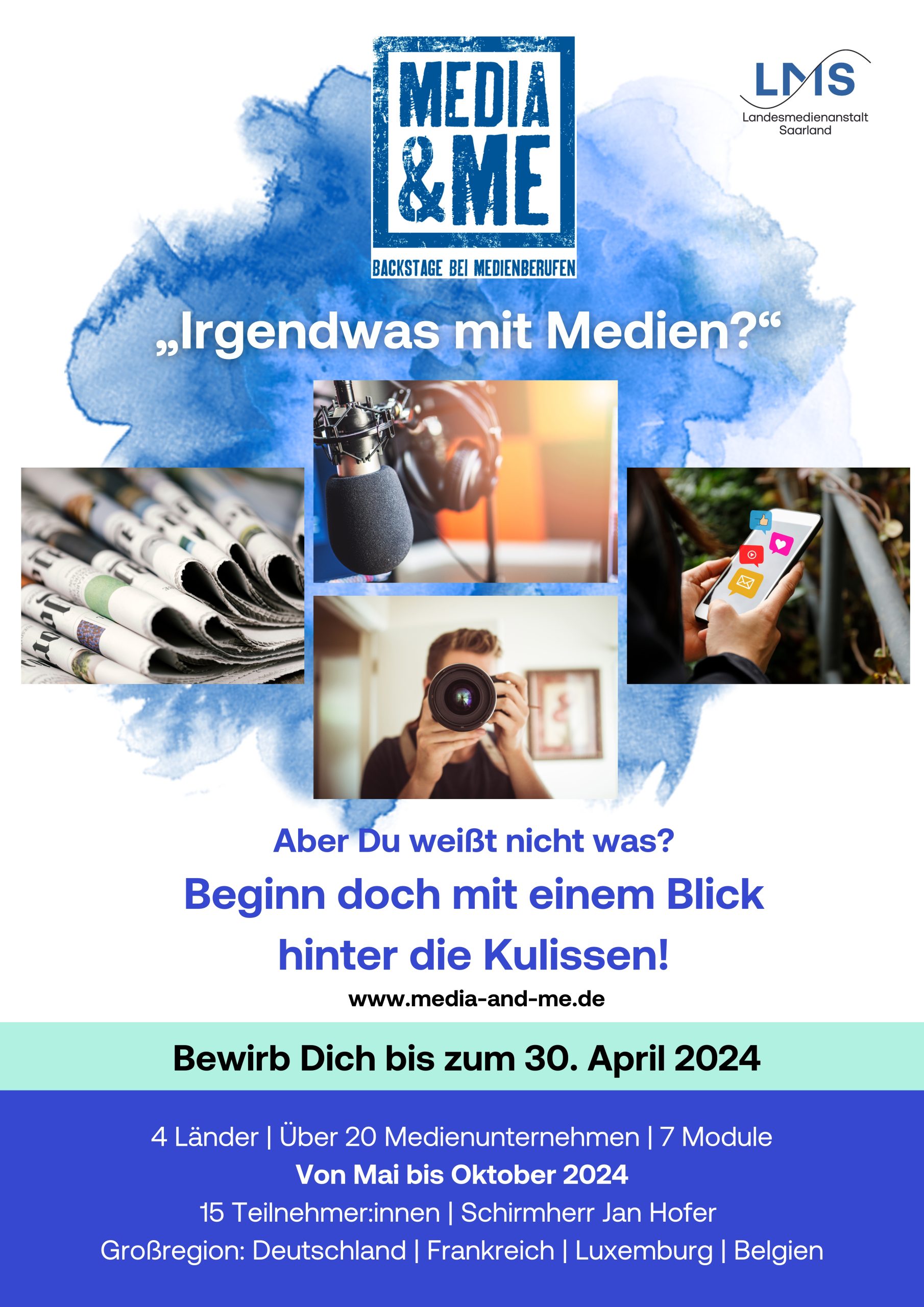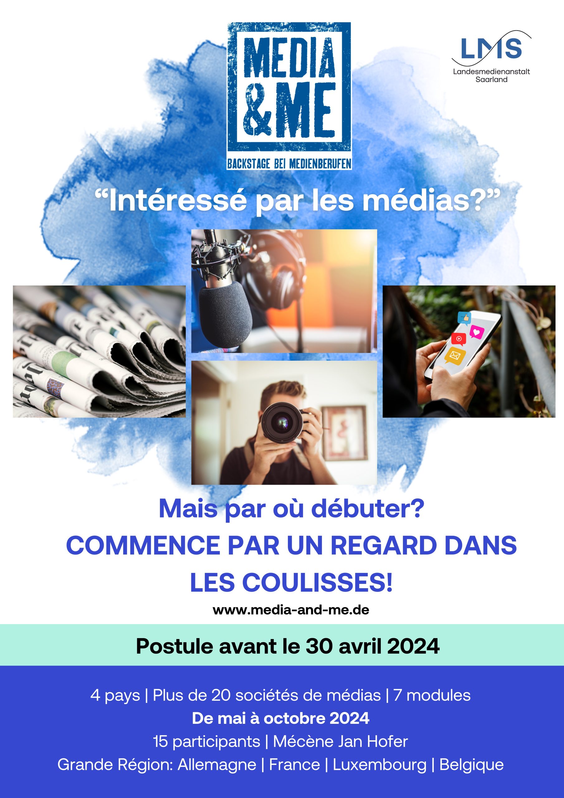 Bis zum 30. April 2024 können sich Interessierte aus der Großregion mit einem Motivationsschreiben, einem Video-/Audiobeitrag oder auf andere kreative Weise bei der Landesmedienanstalt Saarland (LMS) bewerben (media-and-me@LMSaar.de). Eine unabhängige Jury wird bis zu 15 Teilnehmer:innen auswählen. Die Teilnahme ist kostenlos.
